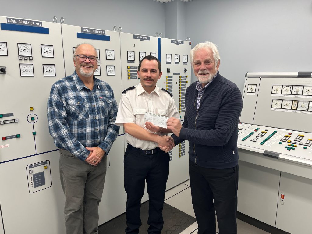 BCIT Nautical Science Cadets, Tyus Barfoot and Bhupinder Singh Dhesi were both recipients of their 2025 Bursary Certificates from Captain Joachim Ruether (NPESC – secretary)
