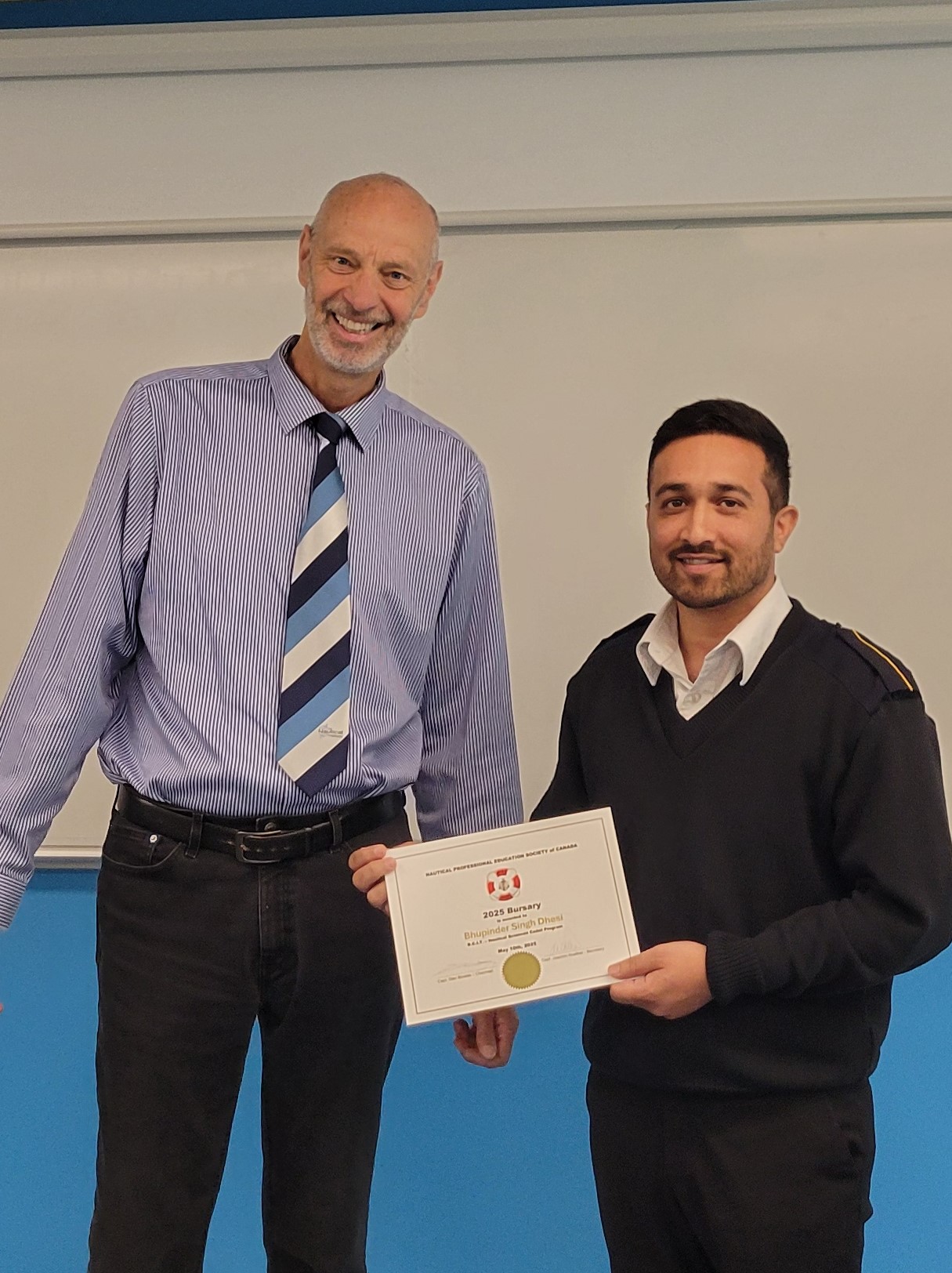 Previous Image Bhupinder Singh Dhesi Captain Joachim Ruether (NPESC) presents Cadet Bhupinder Singh Dhesi with his 2025 Bursary Award Certificate.