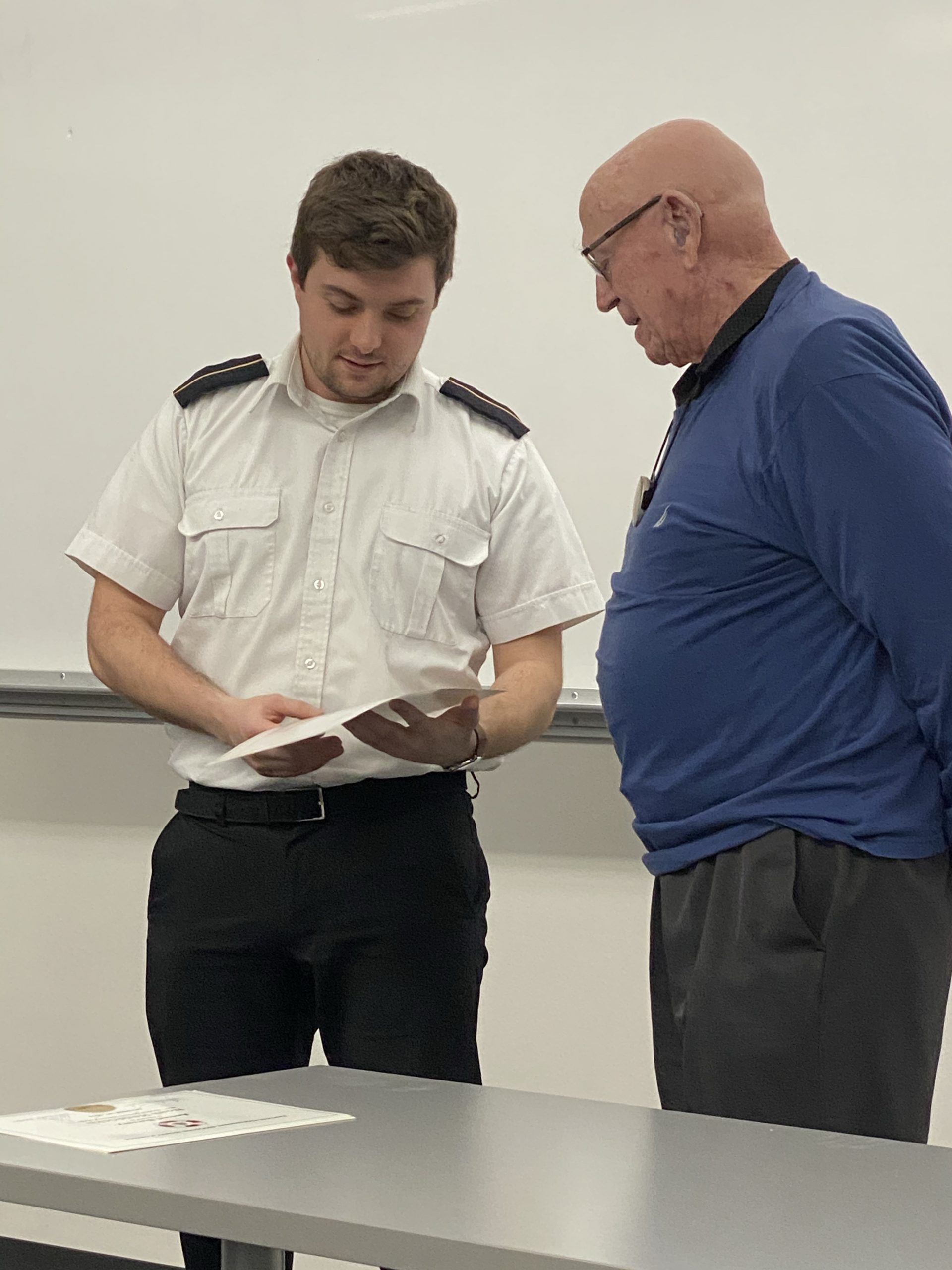 Previous Image Next Image img_1711 Cadet Justin Lamarche receives his certificate from Capt. Harry Allen